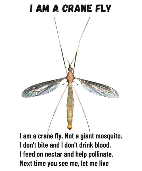 πŸͺΆ I am a crane fly – not a giant mosquito πŸ’› β€’ Don’t kill me! I don’t sting and I don’t drink blood. β€’ I only feed on nectar and help pollinate flowers. β€’ The next time you see my long legs flying gently, β€’ leave me alone – I am one of the good ones.