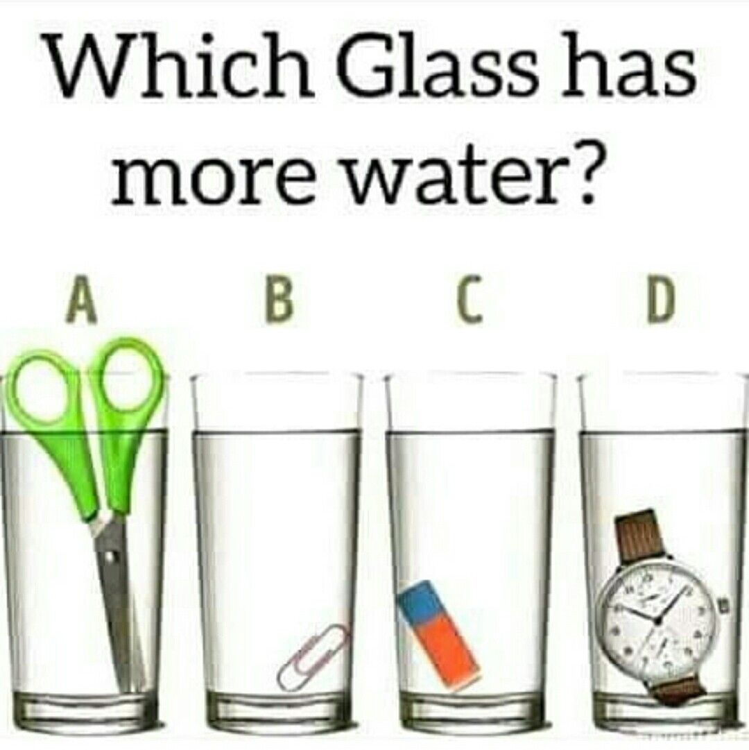 Glass B will be having more water. The area for the pin will be lesser compared to a scissor, rubber or watch as we can see clearly from the image.